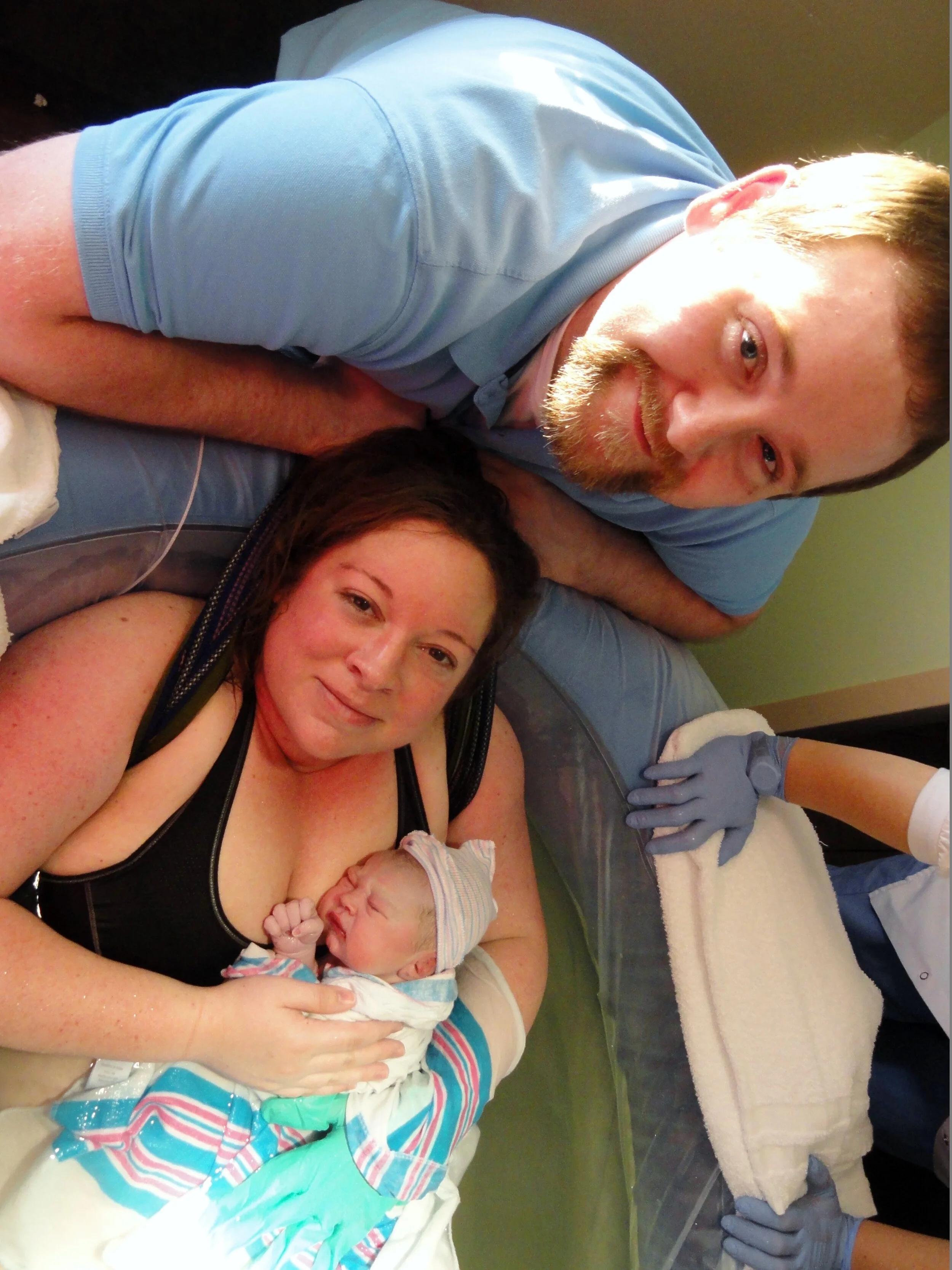 We had been supporting her with the rebozo (a long, strong, tightly woven scarf) but I found tying it and hanging it from the closed bathroom door seemed to give her new power and Carrie was amazed at the difference it made! Anjli arrived to complete the team around 5:25 pm. Stephanie never once asked for any pain medication. She did say a few times she was out of energy but with just a little encouragement, she found her inner warrior and kept working to bring her daughter into the world!
