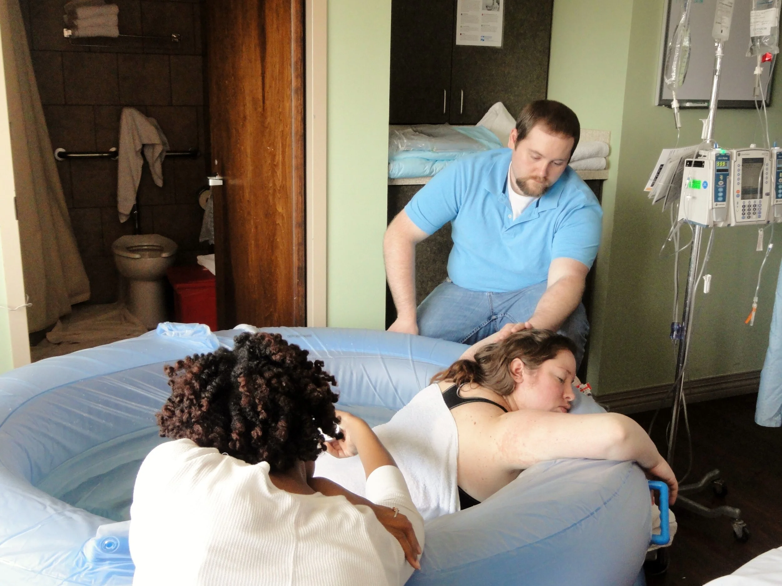 By this time I was out of the shower and lying on my left side on the hospital bed, waiting for the opportunity to climb into the tub. I strongly disliked laboring on the bed. The absence of hot water was making me very aware of my discomfort, but I was grateful for the counter-pressure being provided to me. As each contraction mounted, I remember calling out “Counter pressure, please,” and then the relief would come from someone’s hands. I recall Teresa making a candid comment to the room about how polite I was being.